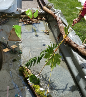 Juni 2015 "Was schwimmt denn da?" Viele hundert Menschen haben anlässlich des 'Langen Tag der Stadtnatur' den Natur-Park besucht. Neben zahlreichen Musik- und Theater-Darbietungen, Naturführungen und Verkaufsständen waren natürlich auch die Sonntagsforscher da. In zwei Wasserbassins konnten sich alle BesucherInnen beim Floßbau beweisen: dutzende kleiner Kunstwerke aus Borke, Ästen und Moos wurden geschaffen und zu Wasser gelassen. Zuletzt wurde das Baumaterial knapp, da der Andrang immer größer wurde. Unser Tip zum Selbermachen: im Baumarkt eine gewöhnliche Baufolie für ein paar Euro kaufen, dicke Äste oder Steine als Begrenzung auslegen, Folie drüber und rein mit dem Wasser. Viel Spaß. |